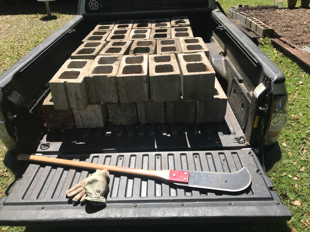 Once we got the forty-five blocks loaded, I trudged them back to the garden, started digging up and removing the timbers, and realized I had no idea what to do with the timbers once I removed them. Part of the garden, the original section, the timbers were deep in the ground, and infested with fire ants. But once again, friends save the day! My friend Mark came over and offered to haul them off for me.