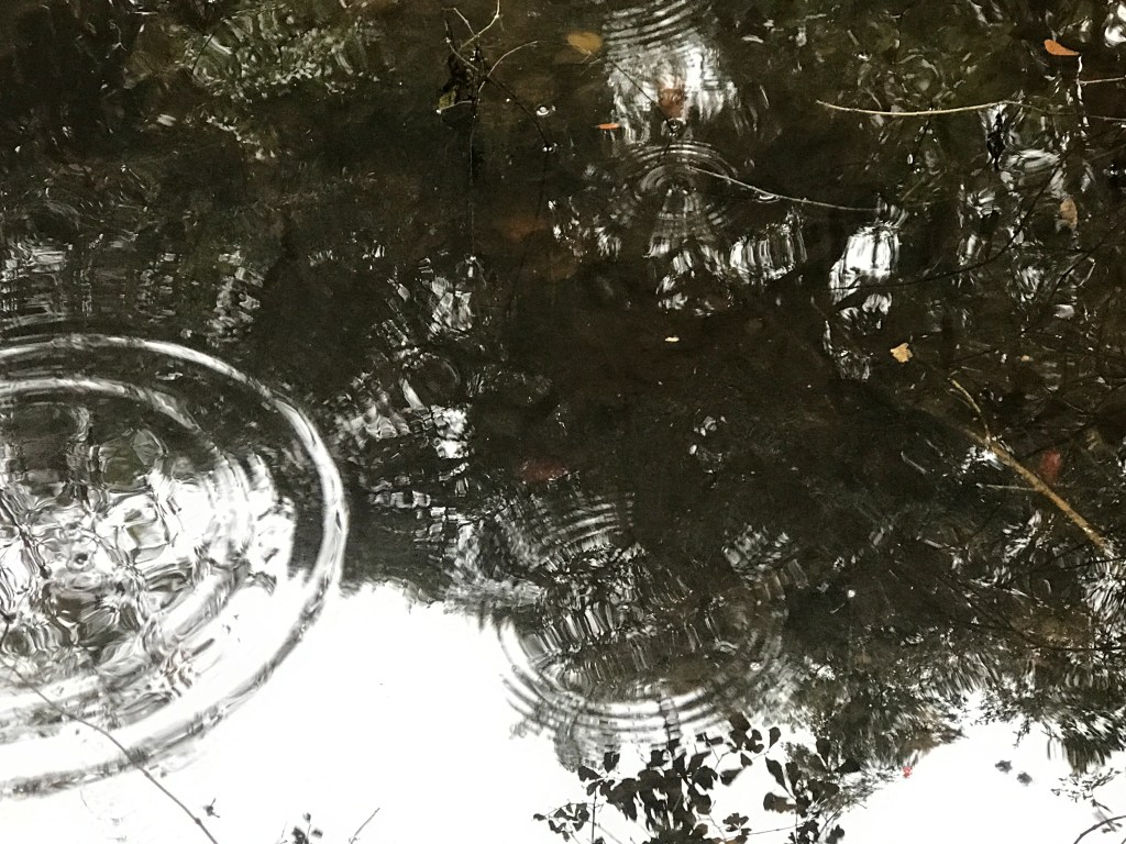 The rain began a couple of hours before noon, a slow descent of drops, which seemed to be the vanguard of many more. By lunch rain was coming down hard, and considering it’s been weeks since the trees or the pond or the plants and animals have seen any rain at all, it was a benison for the Earth. Like putting your ear to a seashell, a roar of water could be heard, rain falling through the leaves of the trees, rushing down to the dry earth, and replenishing what was desperately needed.