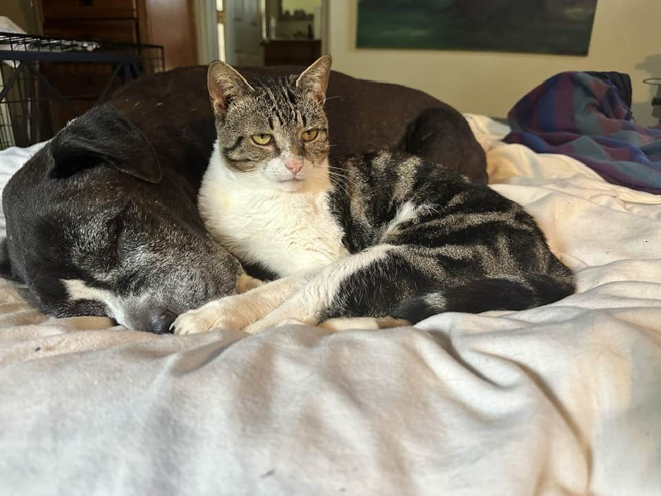 Couple of days ago, Aqaba jumped up on the bed, started head- butting Budlore under his chin. Aqaba doesn’t trust Bud one on one, but with me there, Aqaba thinks this is the time to make friends with the only dog in the house I do not trust with That Cat.