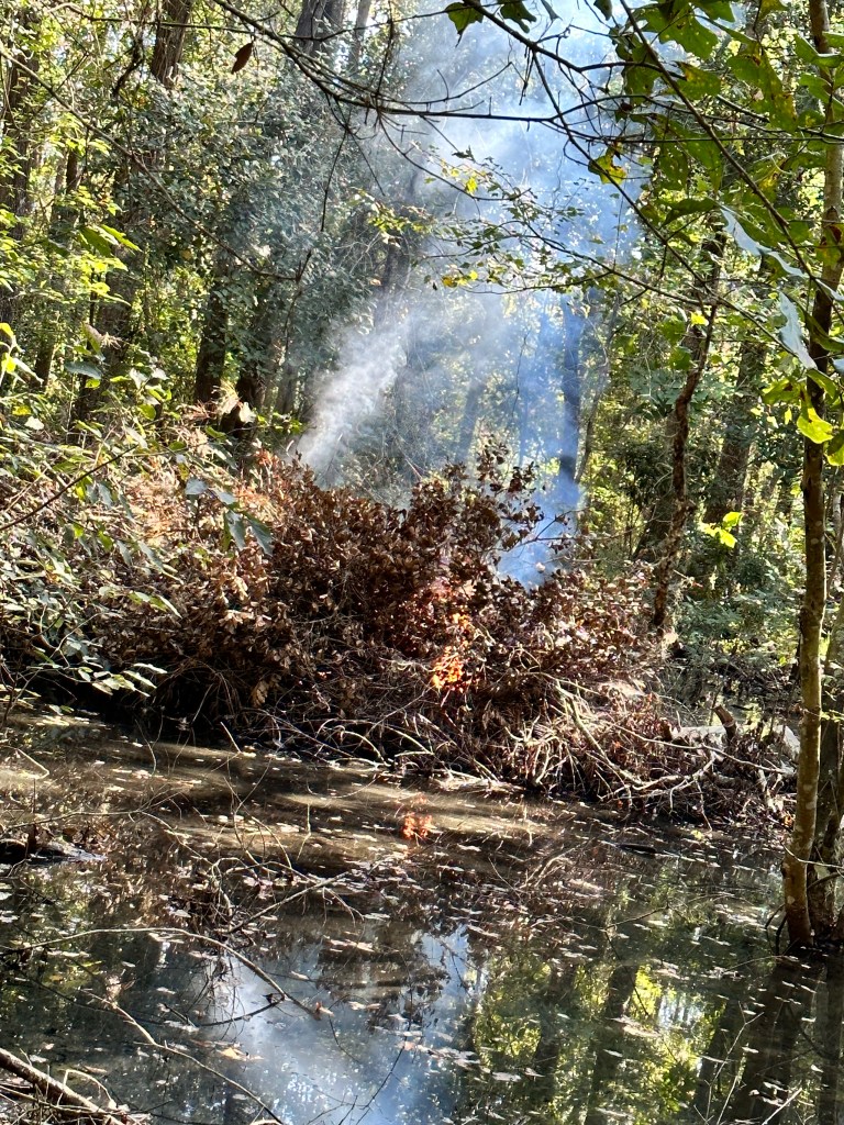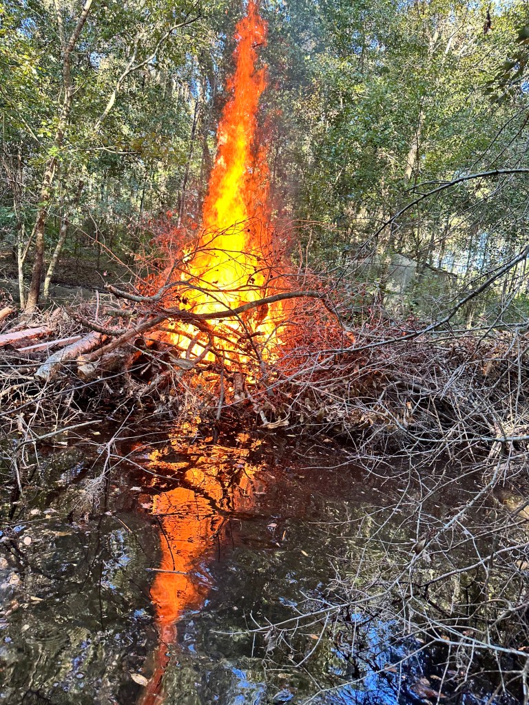 Laborious, is the word of the day. Grab a branch, hold it over my head, wade out to the pile, try to toss it in at the best point, wade back out, rinse and repeat. But I figured out the path in and out, shuffle instead of trying to lift my feet too high, and go slow. The fire goes better than expected. I really though the embers would fall through into the water, but there’s enough fuel in the pile, and it has been compressed tight enough, the fire build up enough heat to feed. And feed it does. The third or fourth trip it I see some of the larger pieces of wood burning brightly. I can feel the heat. This is working. More fuel, please.