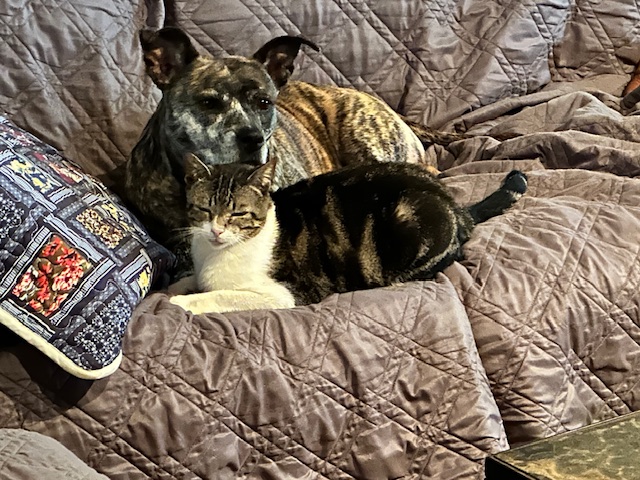 Aqaba stops purring and sleeps now. I’m going to get up and write, but sleep ambushes me, and when I awake it’s past five. Wrex thumps his tail once or twice, waits for an invitation or some sign I’m awake, then joins me, laying down so as to miss pushing the cat. Wrex is like that. He has manners and won’t invade personal space. He gets belly rubs before we get up. It’s his ritual.