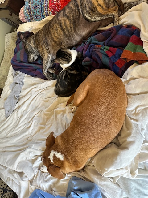 But Aqaba Thomas pushes closer to me, his purrs strong and his volume up. Is this the first time in his life there has been true safety? Is this his primary experience with a guardian, inside a home, and comfort? The purring eases away, and the pack sleeps again.